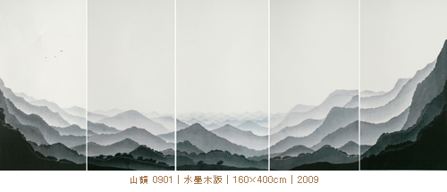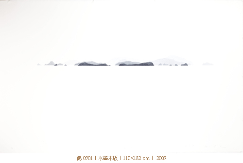 산과 섬은 텅 빈 하늘에 낮게 내려앉은 자태이다. 그 풍경에는 적막함이 감돌고, 허정虛靜한 공간과 단순한 조형미가 돋보인다. 화면은 고요하고 넓어 요활寥豁하다. 간혹 풍경속에 등장하는 큰새나 새떼조차 소리없이 움직이는 듯하다. 묵음?音의 선미禪味가 물씬하다. 옛 문인화의 사의적寫意的 수묵산수화풍을 연상시킨다. 농담변화의 능선이 겹겹한 산세는 전통적 문인화의 ‘임리淋?’하다는 분위기와 딱 맞아 떨어진다.