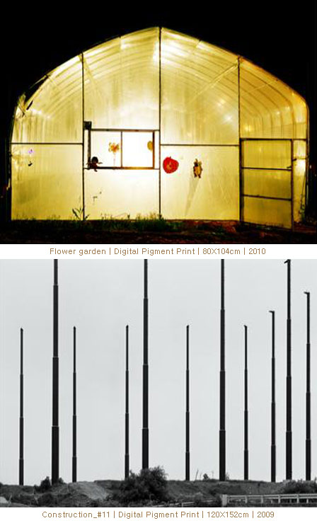 방병상은 일상 주변의 사소한 이야기들을 특유의 시선으로 부담 없이 담아내고 제시해온 사진작가다. 최근 도시생활을 정리하고 정착한 파주에서 방병상은 다양한 삶의 풍경들을 경험했다. 그것들은 파주, 교하지구를 방문한 경험이 있는 사람이라면 대부분 보았을 법한 일반적 풍광들이다. 작가는 특히 가건물 형식의 구조체들에 남다른 관심을 보였다. 처음에는 그것이 무슨 용도인지 몰랐으며, 또 그것들이 지어지고 있거나 짓다만 상태여서 완성태를 짐작하기 어려웠을 것이다. 그러나 방병상은 그것들에 애정을 가지기 시작했다. 남들이 크게 관심을 두지 않는 이 구조물들은 화원이나, 카페, 교회 등과 같은 다양한 기능과 용도로 사용될 것들로, 나름의 내부 공간 질서와 속살을 가감 없이 드러내 놓았다. 과장된 견고함과 매스를 앞 다투어 자랑하기 보다는, 위선 없이 있는 그대로를 자연스럽게 드러내었다. 이점은 방병상의 시선을 잡아매는 독특한 매력으로 작용했다. 카메라로 담기보다는 마음으로 먼저 다가갔다. 앙상한 뼈대를 가감 없이 드러낸 내부구조는 엄숙한 겉모습과는 전혀 다른 진솔한 표정으로 작가에게 화답했다. 기능을 짐작할 수 없는, 다른 듯 닮은 비슷한 구조물의 외부표정과는 달리 마음으로부터의 인사를 작가에게 건넸다.