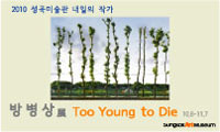 2010 성곡미술관 내일의 작가 방 병 상 展성곡미술관은 <2010 성곡미술관 내일의 작가 : 방병상―죽기에는 너무 젊은>展을 개최합니다. 지난 1998년에 시작된 <성곡미술관 내일의 작가>展은 미래의 한국미술을 이끌어나갈 역량 있는 국내작가를 발굴하고 전시를 통해 지원하는 국내 대표적인 지원 프로그램입니다. 올해는 이 프로그램을 운영한 지 13년째가 되는 해로, 지난 2009년 총 5명의 작가를‘2010 내일의 작가’로 선정한 바 있습니다. 2010년 봄에 열린 <이주형 : 공리적 풍경>, <이명호 : 사진행위 프로젝트>展에 이어 열리는 이번 <2010 성곡미술관 내일의 작가 : 방병상―죽기에는 너무 젊은>展은 선정 작가의 현재적 작업 성과와 미래적 비전을 시각적으로 확인할 수 있는 좋은 기회가 될 것입니다.
