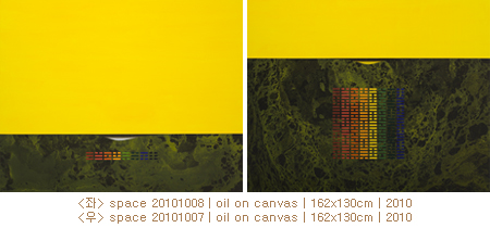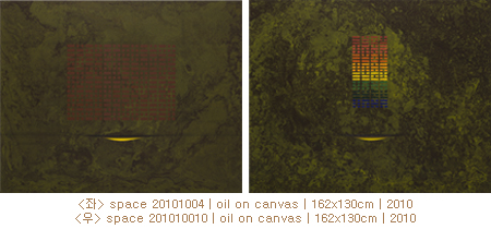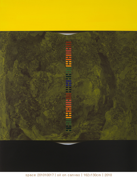 There is a contrasting relation between the basis of painting formed with marbling technique and the "proliferation" of signs, the logical and geometrical symbolic units, on it. The relation provides the surface of painting and its system of representation with rather more elasticity. The underneath part of the structure is formed in the depth of dimension, the internal foundation and external materialization. In other words, a contrast between the support and the signs appeared on the support makes a structural feature of Lee's paintings. Works with geometrical patterns. Or, geometric works with suggestive factors of expressionism. Both could be used to speak of them. However, it is clear that two disparate elements create a kind of harmony filled with tension and form a distinctive world. It seems that the fusion and coexistence of different or contrasting things in Lee's paintings stem from the long-time journey of the artist. We can find the clues looking back Lee's artistic life.