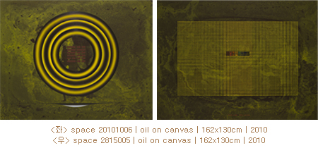 Geometric patterns are made up of circles and small units of signs. Simple and clean. In the meantime, an 'organic' atmosphere of creation covers the whole surface even covering up the inorganic patterns with even more stronger visual illusion. Repetitive use of circles, colors squeezed out from the surface, or small lines arranged with an order on simply structured planes. All elements hold the rhythm of creation inside and melt into the overall harmonious sound of the painting. The color of small bands is unified into black but partly variations of it make differentiated faces filled with changes. The geometrical signs are from the Eight Trigrams for divination. The Eight Trigrams are symbols of Asian vision of the universe which is deeply rooted in Oriental mentality. As the diverse translations of the Trigrams were developed into various outlooks of the world, the symbol used in Lee's works has the potential to be interpreted in many ways. Sometimes the symbol appears as several groups of signs which fill the surface wholly or partly. I think it is not necessary to try to find "signifies" of them since the artist does not have intention to plant any philosophic inner aspects of the signs. They are no more than signs. Just signs. However, the development of them on surface creates a certain order, and this makes the painting rather more plentiful and 'free'. As a whole, there is an eternal development. Over it, there is the rhythm of creation created by small signs. The surface becomes alive like this. It achieves the real existence and its own "presentation".