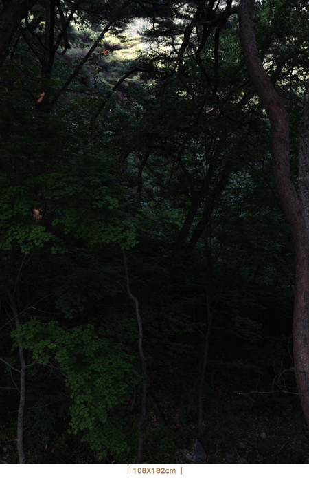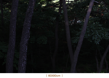 작품들이 어두운데도, 식별을 가능하게 하는 햇빛이 늘 어느 정도 있다. 때로는 중간 거리쯤에 있는 고독한 나무의 몸통 하나가 조밀하게 우거진 나뭇잎들 사이를 뚫고 온 햇빛의 줄기를 만난다. 이렇게 드문 빛의 편린들은 사실 우연적이어서 기본 요소가 아닌데도 첫눈에 어둠 속에서 중심이 되는 초점인 듯 보인다. 작품은 빛의 운동을 필수로 하는 것들 중 하나지만 이 작품들은 빛이 형태를 어떻게 만드는가에 크게 관여하지 않는다. 작가는 빛이 어떻게 특정한 물체에 떨어지는가에 대해서보다는 빛이 있든 없든 형태가 어떻게 연속되는가에 대한 생각을 환기시키는 일에 관심을 둔다. 이 작품들은 어떤 관점에서 보아도 ‘인상파’에 속하지 않는다. 시간의 범위 안에 있는 순간들의 가치에 대한 표현도 아니다. 오히려 그 반대로, 굳이 시간과 관계가 있다고 한다면 이 작품들은 시간 너머에 있는 순간들에 관여한다. 태양이 떠오르고 있든 혹은 떠 있는 상태든 태양의 과정은 작품이 관찰자에게 끼치는 영향들 가운데 아무런 역할도 하지 못한다. 시간 안의 특정한 순간에 매여 있는 보통 작품에 이런 식의 효과를 시도하는 것은 역설적으로 보일 터여서, 김태철의 작품에서 보이는 이 특징은 작품이 그저 그러하도록 작품의 장치를 통제하는 김태철의 기술을 입증할 뿐이다.