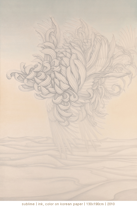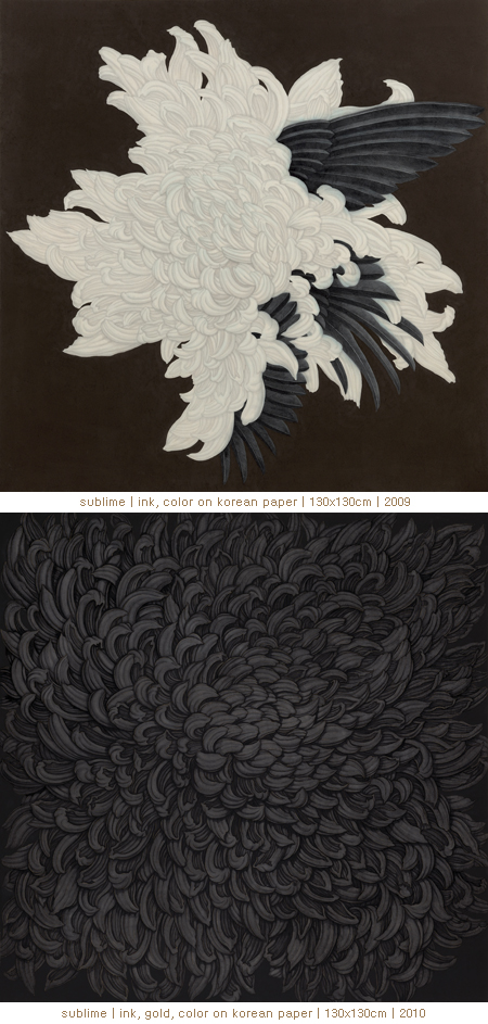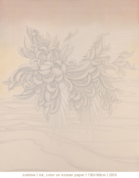 국화와 날개의 도상 적 결합과 해체를 시도한 그의 작품들은 먹으로 구현하는 동양화의 재료적, 기법 적 의미들을 함축시키며 비상(飛翔)을 통한 신화의 뉘앙스들을 부가(附加)