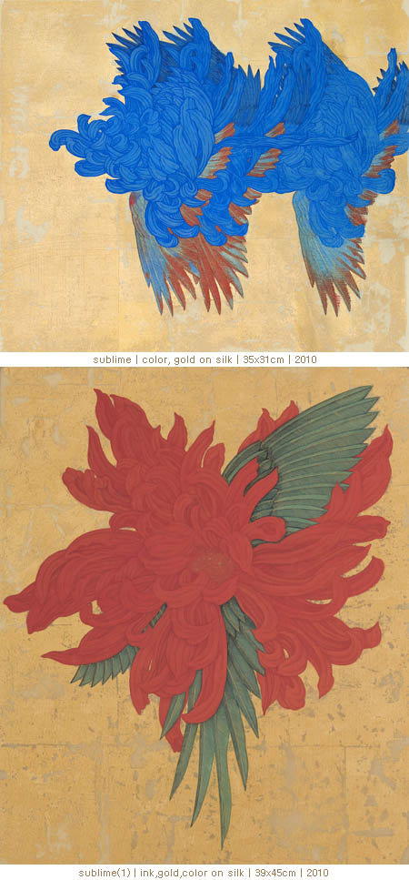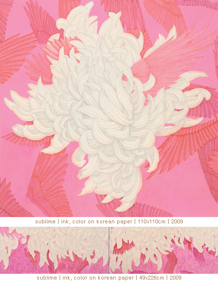 작가는 우주에 관한 자신의 감정을 숭고라는 이름으로 규정짓고 있는 것이다. 숭고는 미약하고 유한한 인간이 느끼는 무한에서 오는 신비하고 초월적인 감정으로, 천상의 뜻을 지상에 알리는 새의 이미지들을 결합시키고 있듯이 작가는 존재의 ‘구원’으로써 국화의 의미까지 드러내고 있다. 작가의 숭고는 자유를 만끽하며 춤을 추듯 천상을 유영한다. 춤추는 숭고들은 우주, 자연, 신과 같은 무한 신성(神性)의 아름다움과 두려움의 노래이자 미약한 작가로 대표되는 인간존재에로의 연민의 손짓들이다.