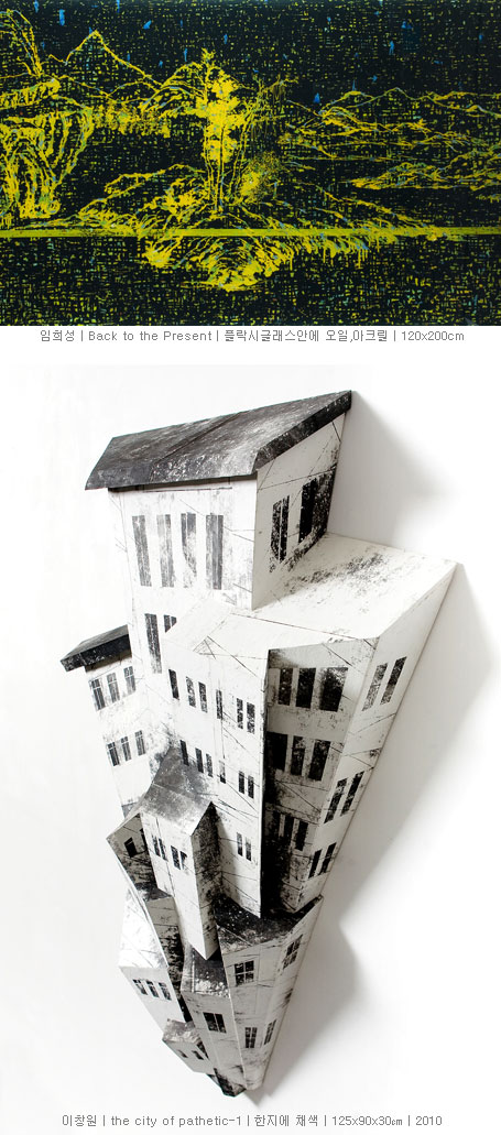 이창원은 우리가 살고 있는 집이라는 공간을 한지로 만들고 아파트를 층층이 쌓아올리듯 구축적으로 조형화 한다. 껑충 솟아 있거나 한강변을 따라 길게 늘어뜨린 집의 형상들이 그대로 화면이 된다. 단순화되고 강조된 동화 같은 집의 서정적 표현이다. 그리기와 만들기가 조합된 조각 같은 화면. 우리의 숨을 담고 있는 비좁은 집을 보면서 담담하고 소소한 삶의 시(詩)를 듣는다.
