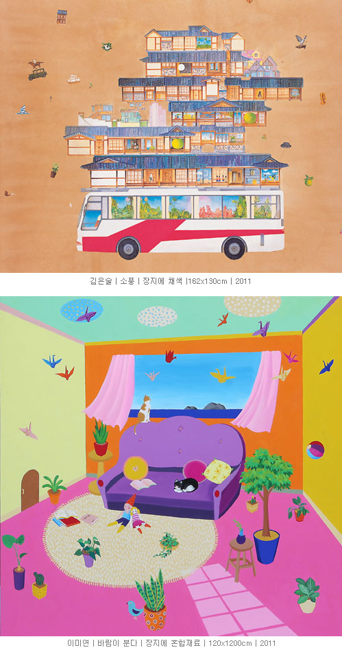 김은술과 이미연은 내적인 기억과 감성이 외적인 풍경을 차용하여 달콤한 환상으로 확장해 가는 모습을 보여준다. 김은술은 아이 적 즐겁고 행복했던 순간의 소풍, 여행과 같은 추억을 버스나 건축물에 넣거나 쌓아올린다. 그래서 그의 화면은 구획 적이고 구축 적이며 섬세한 기억들이 알알이 박혀있는 추억으로의 환기성을 갖고 있다. 그가 감동받고 있는 샤갈의 삶과 작품들도 들어있어 김은술의 작품은 종합 선물 세트와 같은 기억의 작은 미술관이기도 하다. 이미연은 자신의 고양이와 안락한 방을 꿈과 희망으로 부풀어 오른 환상적인 세계로 바꾼다. 그의 고양이는 요술고양이처럼 말을 하거나 생각한다. 한 줄기 시원한 바람이 들어오는 창으로 먼 바다와 같은 고향의 풍경이 펼쳐지고, 나의 방은 달콤하고 경쾌한 조형어법이 만나게 됨으로써 날개가 돋아나는 비밀의 정원으로 향하는 신비의 공간이 된다. 이렇듯 김은술과 이미연은 우리가 갈망하는 잃어버린 세계의 비밀을 열어준다. 그것은 어린 시절의 영원한 이상한 나라를 꿈꾸는 환상이며, 비밀의 방과 같은 내밀한 상상을 꿈꾸는 시적인 희구인 것이다.