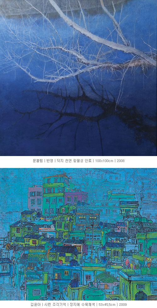 문활람과 김윤아는 고요한 내면의 상태를 끄집어낸다. 화면에 잔잔하게 풀어진 화가의 마음은 호수와 같이 평온하고 새벽의 빛처럼 푸르다. 문활람은 석채의 고운 색으로 자연의 아름다움을 드러냄으로써, 보이지 않는 신(神)의 세계를 구체화 한다. 신이 내려와 존재하는 자연의 숨막히는 영원한 생명성은 작가에게 끊임없이 대화를 시도하는 안과 밖의 설레는 조우(遭遇)이다. 김윤아는 외부의 풍경이 작가의 시선을 투과하여 감성이 증폭된 과거로 변환된다. 지금 서울의 풍경은 선과 선이 만나고 마음과 마음이 교류하는 지난하고 고된 과거로 거슬러 오른다. 빼곡하게 모여 앉은 지붕과 담장과 그들의 삶이 전해주는 빨래줄에 걸린 색색의 옷가지들은 분명코 다정한 온기가 스며 나온다. 빛이 비스듬히 비쳐오는 새벽이나 황혼은 작가에게 무한한 감성을 끌어내는 매개체이며 ,특정한 삶의 뉘앙스가 확장되거나 증폭되는 순간이기도 하다. 어제도 오늘도 내일도 어김없이 떠오르는 태양은 화가의 기억에 마치 시인이 시를 쓰듯 푸른빛, 황금빛 기억을 던진다.