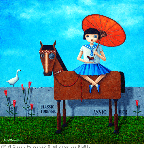 강미령은 민화와 서구 팝아트의 결합을 시도 한다. 한국전통 미술과 1950년대 미국의 아방가르드에서 1960년대 팝아트까지, 전통과 현대라는 이분법을 화면에 배치함으로써 미술의 자기역사성을 되새김질하고 있다. 그의 이질적인 두 문명의 만남과 역사와 전통 그리고 전복(顚覆)이라는 대립되는 항목은 작가의 기억이라는 제 3의 공간에 묶어 둔다. 그리고 조용하고 부유하며 성찰한다. 그래서 그의 화면에는 동시대인의 기억의 괘적 들이 반세기 그 이상을 아우르는 거꾸로 가는 시간의 거대한 소리와 흐름을 고스란히 담아내고 있는 것이다. 저 먼 기억 속에 철저히 구조화된 세상에서 작가는 다시 소녀 적 미령이 되어 살아 숨 쉬고 있다.