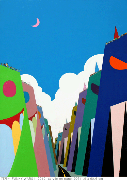 강미령의 작품이 시대의 아이콘이 된 예술적 흔적들에 빗대어 은유하고 구조화한 풍경이라면, 김기범의 작품은 기억의 파편 하나하나의 흐릿한 기억들을 쏟아낸 잔상으로 채워 넣은 마음속 감정의 풍경이라 할 수 있다. 사랑, 이별, 미움, 증오와 같은 작가의 잔상들은 뚜렷하게 화면으로 기억된다. 빼곡하게 쌓아올리고 구성한 새로운 도시 안에서 작가는 추억을 헤집듯, 아니면 추억을 채집하듯 마치 과학자의 시선으로 세상을 관찰한다. 그 속에는 어릴적 행복한 수퍼맨, 베트맨과 같은 영웅의 꿈이 담겨 있고 젊은 그들의 상처 받은 영혼들이 숨겨져 있다. 이것은 화려하게 포장된 선물 꾸러미의 도시가 되기도 하고, 색색으로 치장한 무기로 가득한 도시가 되기도 한다. 이 모든 것이 마음속의 작은 알갱이들이 튕겨져 나온 확장된 세계이며, 작가의 머릿속에 남겨진 증폭된 거대한 세계의 모습이기도 하다.