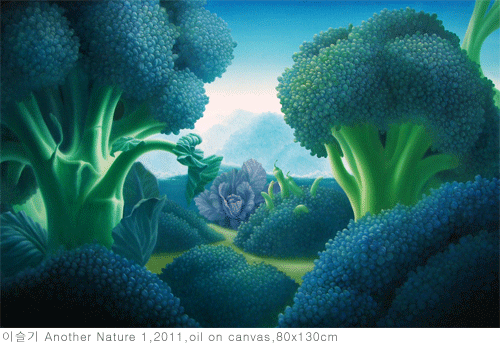이슬기는 브로컬리, 파, 고추, 오이 등을 구성하여 제 3의 자연을 만들어낸다. 초 식물성 환상특급이다. 사실, 이들은 모두 건강한 생명력을 부여하는 식물성의 야채들인데, 자연의 유사성을 빗대어, 나무가 되고 산이 되고 숲이 되었다. 작가의 신선한 상상력이 온통 먹을 것으로 가득한 푸른색 세상으로 변모되었다. 이곳의 사람들은 오이 보다 작고 브로컬리 보다 작겠다. 그 아래에서 집을 짓고 사는 반지의 제왕에서의 호빗족처럼, 꿈과 상상과 모험으로 가득한 작은 세상의 이야기. 어쩌면 이것은 걸리버화(gulliverisation)라 하여 걸리버가 간 소인국의 모습처럼 대상과 주체의 반전이나 미시와 거시의 반전을 말하는 것인지도 모른다. 현대 기호의 가치사회에서 아님 알맹이 없는 껍데기로 가득한 떠다니는 시뮬라크럼(simulacrum)들 사이에서 오롯한 본질적인 것, 우리의 기원적인 것, 자연적인 것을 되찾기 위한 은유로 보여 지기도 한다.