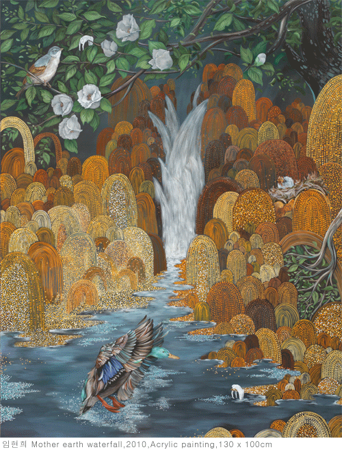 이효은이 문이라는 상징적이고 신화적인 이미지를 끌어들이듯이, 임현희는 원형 이미지를 통하여 상상력이 어떻게 상징과 신화성으로 합치되어 가는지를 보여준다 하겠다. 그의 화면에 등장하는 나무, 새는 모든 문명이 공유하는 신화의 원형을 담고 있다. 나무는 우주목일 것이며 이는 인간과 신을 연결하는 매개체이고 인간에게 생명을 전해주는 것이다. 새는 하늘과 땅을 마음 것 날아다닌다는 본성에서 신의 전령이자 영혼을 천상계로 승천시키는 영물(靈物)이기도 하다. 생명이 움직이는 에너지를 하나하나의 선으로 표현하고, 마치 섬유다발을 보는 것처럼 살아있는 형상의 나무와 영혼과 새들이 신비한 숲속에 가득하다. 즉, 이곳은 신화의 땅일 수도, 천상의 그곳일 수도, 극락일 수도 있는 것이다. 은유가 상상력과 창조를 위한 문학적 수사법이듯이, 상상력의 귀착점은 무의식의 세계, 언어로 표현할 수 없는 세계, 곧 신화 세계의 가시화이다. 따라서 신화는 상징의 의미구조이므로 은유는 상상력으로 가는 창의적인 방법이고, 상상력은 상징이해를 위한 연결물임을 알 수 있다. 상상력이 어떤 세계와의 원시적이고 근원적인 접촉이라 한다면 임현희가 그리는 기원적이고 신화적인 공간은 상상력과 창의력이 논리적으로 조합된 이상적인 곳임을 알 수 있다.
