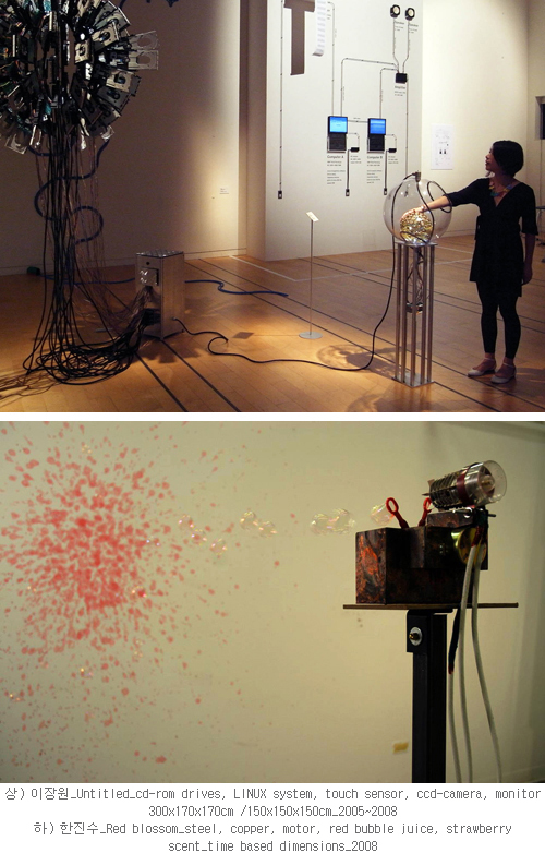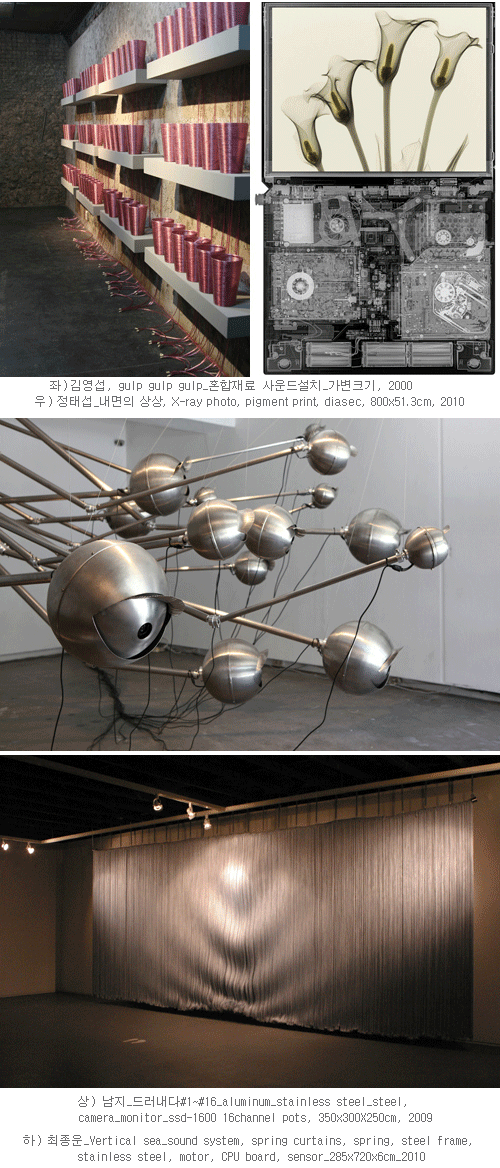 전시에 참여한 작가들은 각각 시각, 사운드, 미디어, 기계 등의 테크놀로지를 활용하여 다채로운 효과를 작동시킨다. 남지의 기계 작업은 기계의 일반적인 유용성을 벗어나 개인의 내밀한 심리와 욕망을 포함하여 사회적 관계에 대한 작가의 남다른 사유를 담아낸다. 아울러 부단히 다른 담론들과의 접합을 통해 이들 감각 테크놀로지의 문제가 물리적인 시공간을 벗어난 감각장치일 수 있음을 색다른 방식으로 보여준다. 미적인 기능을 파생시키는 작품-기계인 셈이다. 컴퓨터 엔지니어이자 조각가로서 정교한 기계-전자적 장치를 실험하는 이장원은 자연과 테크놀로지, 가상과 실재의 영역을 예술로 끌어들인다. 버려진 CD_ROM 드라이브와 센서, 복잡한 전선들을 활용한 설치로 관객의 움직임과 작가의 프로그래밍을 무작위로 결합시킨 이번 작업은 SF 영화 속에 나올법한 기괴한 조각적 이미지를 연출하면서, 마치 살아있는 기계-생명이 작동하는 것처럼 또 다른 차원의 자연의 원리를 향해 나아간다. 홍성철의 신체의 이미지를 사진에 담아내어 이를 줄String 위에 프린트 한 후 여러 겹의 레이어로 재조합한 〈String-Mirror〉 시리즈는 독특한 시각테크놀로지를 작동시킨다. 거울효과와 착시현상, 입체적인 조형 이미지가 묘하게 결합된 이 작품은 사진적 이미지를 담아낸 각각의 줄이 규칙적으로 배열되어 공간 속의 시각적 움직임과 착시에 의한 동적인 파동을 만들어냄으로써 이미지 효과를 발휘한다. 특히 이 작품은 관람객의 시선을 참여시켜 끊임없는 상호교차를 통해 작품이 완성되기에 아날로그적이지만 디지털 한 감성조차 느끼게 하는 일종의 인터랙티브한 작업이기도 하다. 우주+림희영은 의뭉스러운 몽상가처럼 부단히 엉뚱하고 기발한 기계 장치를 만들어냄으로써 현실과 판타지가 교차된 내러티브의 세계를 구동시킨다. 이들 기계장치들 역시 현실적인 유용성을 만들어내는 테크놀로지라기보다는 유쾌한 상상과 정서적 효과를 작동시키는 별난 기술들이라 할 수 있다. <세계의 입구 탐지기를 위한 조타장치>는 세계의 입구를 탐지하겠다는 야심에 찬 상상을 위한 장치이고, <나이스엔진>도 상상 동물인 용의 꿈틀거리는 시각적 이미지를 통해 판타지를 유도하는 작품들인데, 작가들이 현실 속에서 꿈꾸는 수다한 공상들은 이러한 기계를 만들기 위해 그려놓은 숱한 드로잉 작업과 이를 현실화시키기 위한 설계도에서도 확인해볼 수 있다. 정태섭은 가시광선에 의존하는 일반적인 시각을 넘어 X-레이에 의해 투과된 비가시적인 다양한 사물의 내부구조를 표현한다. 작가가 가시화시키고 있는 것은 단순히 보여 지지 않은 사물의 이면만이 아니다. 볼 수 없는 것을 보려하는 미학적 시선에 의해 포착된 생명과 자연의 내밀한 질서들로, 작가에 의해 새롭게 구성된 세계를 드러내고 있기 때문이다. 이렇게 테크놀로지와 결합된 시각 이미지 작업은 다시 렌티큘러 3D 등과 같은 부단한 실험으로 이어져 진지한 작가적인 실천으로 거듭나고 있다.