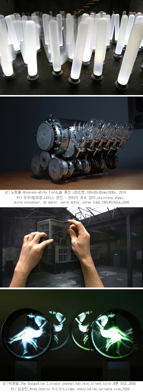 이학승은 단순히 소리를 시각화시키는 것 이상으로 소리와 연동된 신체의 감각 지각으로 이어지고 사회적 의미의 관계망으로 나아간다. 소리를 미디어 기술로 활용하여 작가의 다양한 문제의식을 펼쳐내고 있는 것이다. <양수 속에서>는 퍼포먼스와 결합된 작업으로 인간 신체의 내면의 소리에 귀를 기울이게 하는 작업이다. 물속에 밀폐된 존재는 서서히 자신의 신체가 내는 소리에 집중하게 됨으로써 자신의 근원적인 존재를 인식하게 된다. <소리약>의 경우도 실재 치료의 기능을 수행하지는 않지만 약이 각각의 음이 신체의 각 부분을 치유할 것이라는 작가의 소망과 믿음을 전하는 것 만 같다. 김영섭은 현대인의 일상 속에서 발생하는 갖가지 사운드에 관심을 기울인다. 이들 소리들은 작가의 말처럼 도시사회의 문화적 잉여물들로 도시의 또 다른 이면이라 할 수 있는 욕망과 무의식을 드러내는 것들이다. 작가는 이를 가시화, 무대화시킴으로써 현대적 삶의 부조리한 일상과 낯선 정황들을 전한다. 일종의 오브제화된 소리-설치인 셈인데, 작가는 이를 통해 도시가 품고 있는 다양한 표정을 펼쳐 놓는다. 한진수는 테크놀로지를 활용하여 개인의 정체성과 사회의 관계에 대한 성찰을 담아낸다. 작가가 드러내고자 하는 것은 사물에 내재한 모순적이고 이중적인 의미이며, 사회적 시스템에 의해 변주된 존재의 본질에 대한 것들이다. 그렇기에 복잡해 보이는 기계장치들은 어떤 유용한 효과를 작동시키는 것이 아니라 작가의 말처럼 천국과 지옥 사이의 경계지대, 중간계인 림보(limbo)의 영역에서 작동되는 개념들이고 정서효과들이다. 때로는 작가의 개별적인 경험 속에서 사회적 시스템의 복잡하기만 한 사유들이 녹아있기에 그의 기계들은 복잡해 보이는 외관 이상으로 세상에 대한 깊이 있는 성찰을 가시화시킨다. 박준범의 미디어 작업은 미디어아트가 가진 흥미로운 속성을 활용, 자신만의 독특한 기술을 활용하여 영상을 만들어낸다. 이번에 전시되는 두 작업은 동일한 장소를 배경으로 하고 있지만 〈the occupation 2〉가 사진적 이미지의 원근법적 왜곡을 활용하여 작가가 마치 조물주처럼 공간을 만드는 것 같은 착시를 주는 영상이라면 〈Strong piety〉는 (조물주의) 명령에 따라 교회의 구성요소를 직접 만드는 작가의 퍼포먼스가 전면에 드러나는 작업이다. 서로 다른 두 작업이지만 미디어를 대하는 특유의 방식이 교차되고 있어 작가가 기술로서 미디어를 활용하는 방식을 고스란히 드러내는 작업들이라 할 수 있다. 최종운은 고요함과 긴장감이 동시에 공존하는 순간들에 주목한다. 일상의 미세한 움직임에서 거대한 자연의 움직임이 전하는 다양한 감정을 기술적 장치를 통해 구현하는 것이다. 작가가 활용하는 기술 장치는 공간 전체로 확장되는데, 관람자의 내밀한 감각과 공간의 긴장감을 충돌시켜 밀도 있는 공감각을 만들어 낸다. 결국 작가는 테크놀로지를 활용하여 보이지 않는 내면의 긴장감과 공간을 가득 메운 감각화 된 공명을 전달하고 있는 셈이다. 임창민은 인간적 현존의 문제를 독특한 비디오 설치 작업을 통해 가시화시킨다. 이번에 선보이는 〈mind control 5-2, 5-3〉은 굴레와도 같은 삶의 한계 속에서 쳇바퀴를 돌 듯 끊임없이 무언가를 욕망하지만 다시 반복하고야 마는 실존의 상황을 극명하게 드러낸다. 자신의 의지와 상관없이 주어진 한계 속에서 돌고 도는 갇혀진 인간 존재의 어떤 상황을 담아내는 것이다.