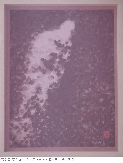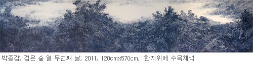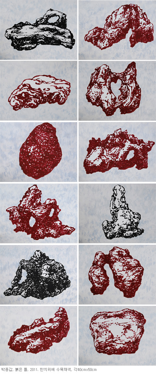 “검은 숲 - 붉은 돌”이라는 타이틀로 선보이게 되는 이번 전시작품들의 제목을 살펴보면 ‘검은 숲 열 두번째 날’, ‘날숨’, ‘붉은 돌’, ‘영의 숲’, ‘나르시스의 호수’, ‘각(角)’, ‘막(幕)’, ‘후후(後後)’, 등의 명제를 달고 등장한다. 이전의 작품들이 수행자로써 바라보는 인생길을 드러냈다면 근작들은 인생길에 무심히 스쳐 지나갈 수 있는 사물들과의 대면 혹은 대화를 담고 있다. 생동하는 자연의 기운이 담긴 풍경 속에 생경한 에너지를 충전 시킬 수 있을 것이다.