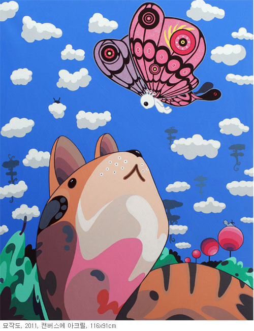 자신의 세계로 재탄생시키고 있다. 즉, 작가의 <조선의 그림을 훔치다> 시리즈는 시선을 사로잡는 현대미술의 매력적인 요소를 함의하고 있다. 팝아트와 같은 어법과 현대인의 정서를 포착하고 음미하는 반어와 역설 그리고 동양 사유의 생명론에 이르기까지, 모방이 창조에 이르는 긍정적 모색의 과정을 담아내고 있는 것이다. 그 속에는 놀랍고 즐거운 상상력과 짜릿한 감정의 유쾌한 즐거움을 동반하고 있다 하겠다. (2011.12)