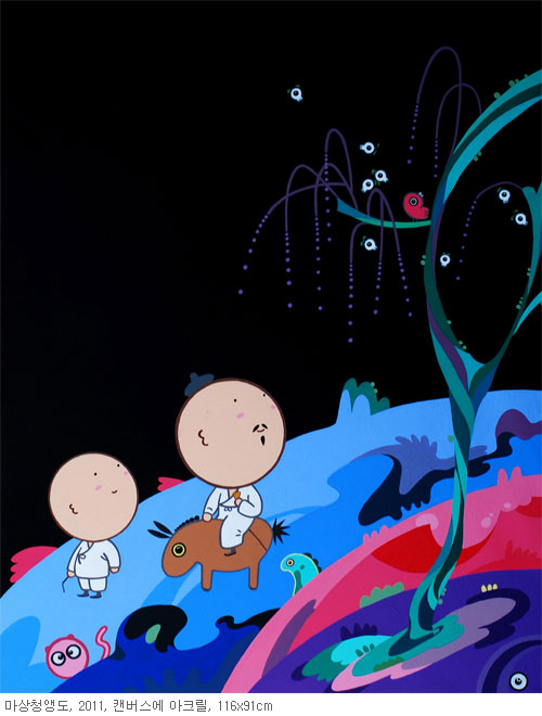 사실 작가의 캐릭터 가득한 요동치는 화면에는 하나하나 감상의 과정이 숨겨져 있다. 그의 화면에는 전통산수화가 구현하였던 삼원법(三遠法)의 고원(高遠) · 심원(深遠) · 평원(平遠)을 오르내리는 자재(自在)로운 시선의 흐름이 간취된다. 산재(散在)된 눈빛의 표정들을 따라 곳곳에 숨겨진 생명체들을 찾아내는 재미는 유년기의 놀이와 같이 화면으로 빠져들게 만든다. 작가의 유희가 펼쳐진 세계로 말이다.