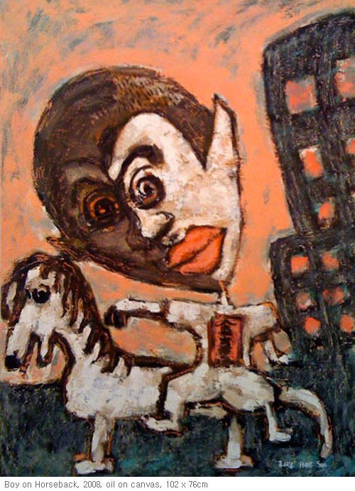 삶의, 그림의 본능과 순수…부지런하고 악착같음도 있는 것 같고 수단도 좋아 보이고 혹은 그 나름으로 터득한 생존논리의 구현 같다는 생각이 들었다. 그의 조건 역시 젊은 작가 대부분의 덫이나 운명일텐데 그런 상황 속에서도 작업의 열망을 꿈꾸며 쉼없이 작업을 해내고 이를 전시로 연결시키는 한편 그림 그리는 사람으로서의 ‘끼’가 두드러진다고 보여진다. 김희수의 그림은 그런 자기 삶의 방식이 고스란히 내비쳐진다는 생각이다…