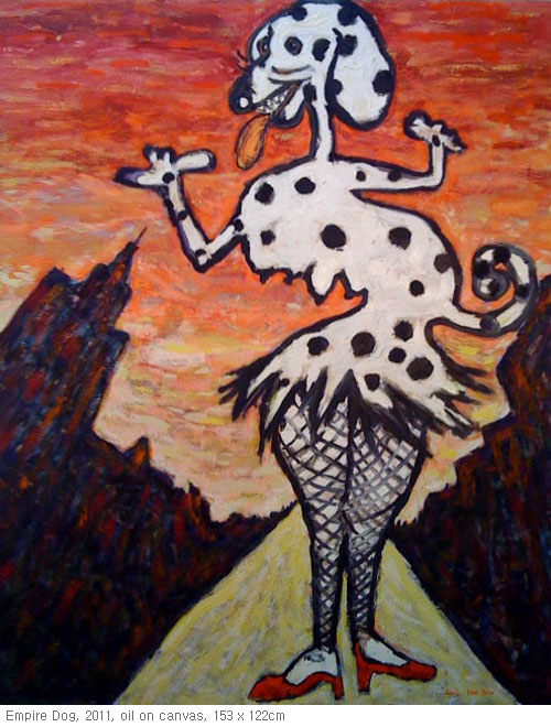 김희수의 작품에서 빠지지않고 보여지는 해학적이고 희화화된 형상은 현대문명 혹은 시장에 물들지 않은, 어떠한 순진무구함으로 나타난다. 그의 이러한 순진무구함은 강제되지 않고 진심이 어려있다. 그의 작품 ‘Empire Dog’를 보면, 망사스타킹에 빨간 색 하이힐을 신고 흰 바탕에 검정색 폴카 도트 혹은 흑백의 호피무늬 드레스를 입은 한 여인이 어떤 길가 중심에 서있다. 그녀는 양쪽 빌딩들에 둘러싸여 있고, 하늘은 세상에 종말이라도 온 듯 성이 난 주황색으로 칠해져있다. 그의 작품이 야수적이고 원시적인 화풍으로 작업되었기 때문인지 그것은 강력한 체험을 야기한다. 그의 그림은 전지적인 관점에서 한 거리의 매춘부를 묘사하고 있다. 우리는 그녀의 직업에 대한 구체적인 사실을 모르는 반면, 그 형태가 상징하는 저돌적이고 에로틱한 도시의 활기와 그 끊임없는 움직임을 확신한다.