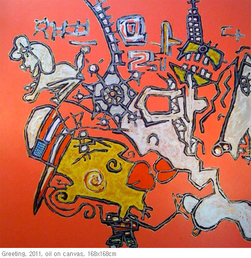 그의 또다른 작품 'Greetings'에서, 익살스럽게 표현된 한 커플이 키스를 하기 직전이다. 남자는 미국 국기로 장식된 야구모자를 거꾸로 쓰고 있고, 여자의 가슴을 만지고 있다. 대조적으로, 여자는 교각 구조물을 연상시키는 특이한 모자를 쓰고 있다. 그녀의 양 옆 상대적으로 화면의 위쪽에, 왼쪽으로는 푸들이, 오른쪽으로는 말머리와 같은 동물이 보인다. 또한 상형문자와 같은 문자그림이 주황색 배경의 허공에 걸려있다. 이국적이고 기이한 형태에도 불구하고, 혹은 그러한 형태로 인해, 그 이미지는 기묘하게 어떤 연민을 자아낸다. 더욱 깊은 의미에서, 그의 그림은 사랑이 단순히 무언가 말로 표현되는 것 이상의, 사실상 물질적 혹은 육체적인 것으로 변화하는 순간을기발한 방법으로더듬어 내려간다. 작가는 소박한 일상을 제시하면서 세상을 에로틱하게 표현하는 것에 탁월한 능력을 지녔다.