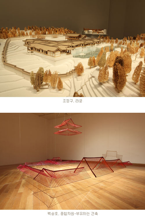 두 번째 파트에 들어가기에 앞서 이번 전시에 대한 시각적인 메타포로 설치된 백승호 작가의 작품들이 2층 2갤러리 초입에서 관람객의 시선을 사로잡는다. 가느다란 선재로 한옥의 지붕을 표현한 그의 작품 ‘종합차원-탑’, ‘종합차원-물체와 그림자’, ‘종합차원-부유하는 건축’ 은 마치 3차원의 공간 속에 드로잉을 한 것처럼 입체와 평면을 넘나든다.