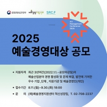 문화체육관광부(장관 최휘영)와 (재)예술경영지원센터(대표 김장호)는 (재)수림문화재단(이사장 전경희)과 함께 예술산업 발전에 기여한 우수 경영사례를 지속적으로 발굴하고 확산하고자, 2012년부터 <예술경영대상>을 운영하고 있습니다. 올해 14회를 맞는 <2025 예술경영대상> 공모에 예술경영 관련 우수사례를 공유하고자 하는 우수 예술기업 및 단체, 예술분야 지원기관, 예술경영인(개인)의 많은 관심과 적극적인 참여 및 추천을 부탁드립니다.